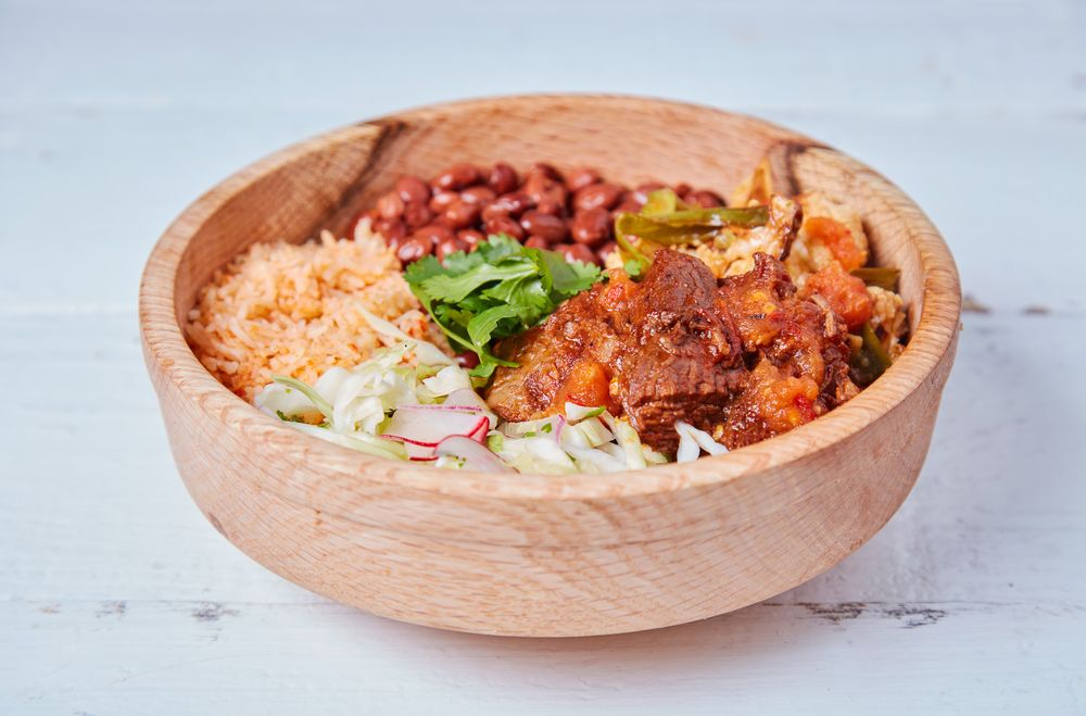 Nopalito Taqueria - Braised beef in dried chili and tomato, Mexican rice, pinto beans, roasted vegetables, crema, citrus slaw, spicy salsa roja, and cilantro.