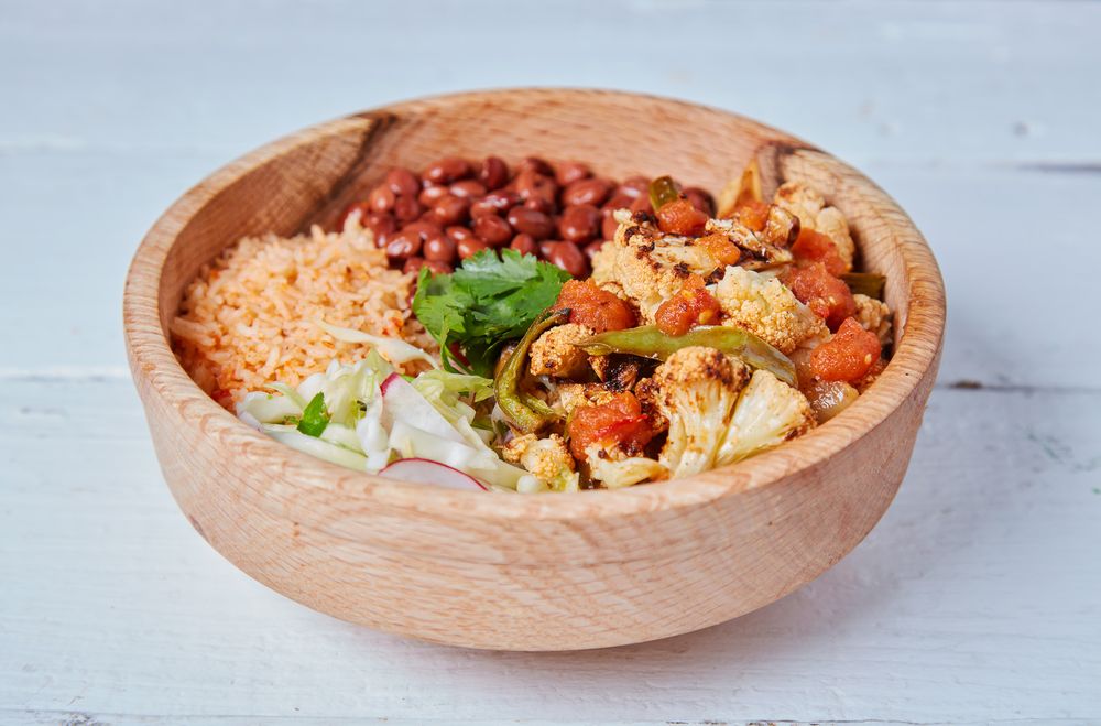 Nopalito Taqueria - Roasted cauliflower with poblano pepper, Mexican rice, pinto beans, crema, citrus slaw, spicy salsa roja, and cilantro.