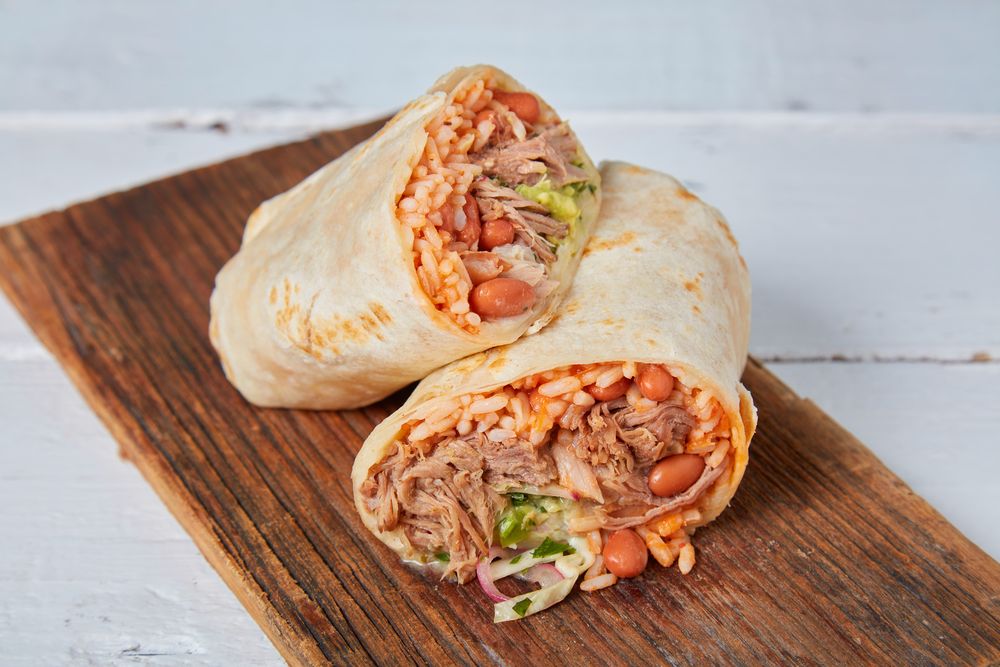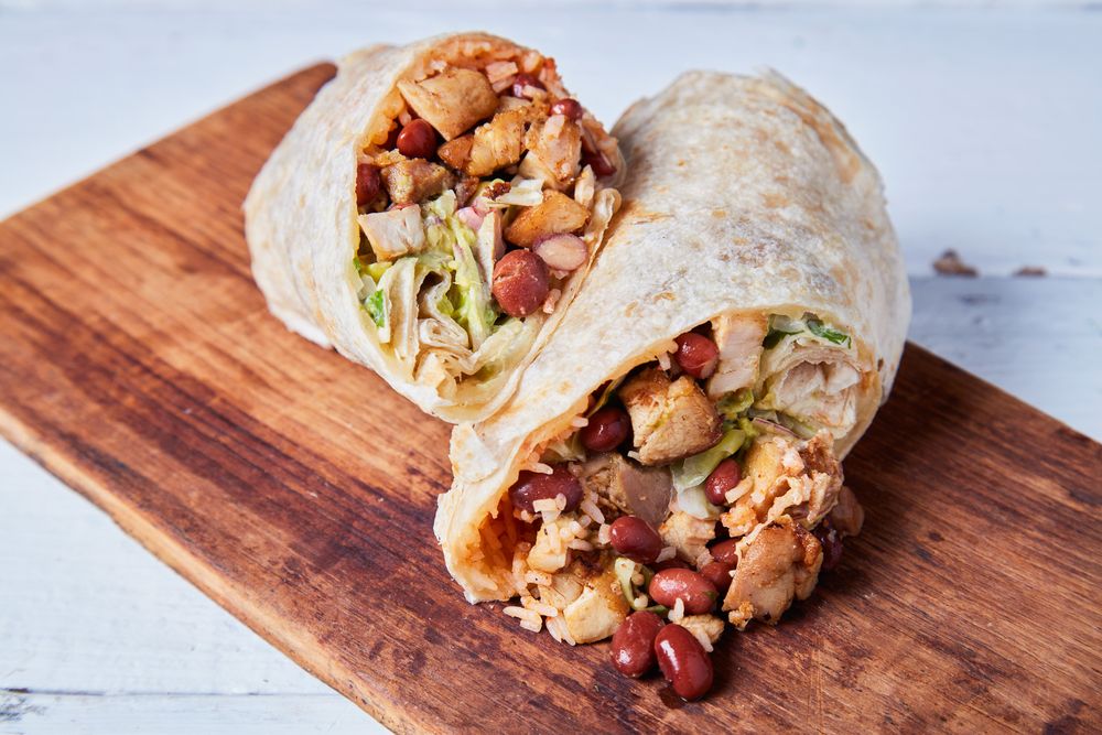 Nopalito Taqueria - Grilled chicken, Mexican rice, pinto beans, Monterey Jack cheese, crema, guacamole, citrus slaw, and spicy salsa roja in a flour tortilla.
